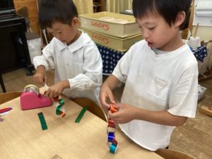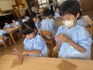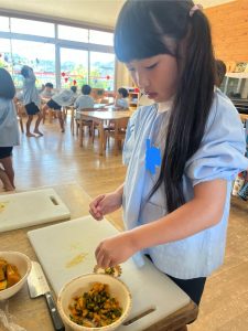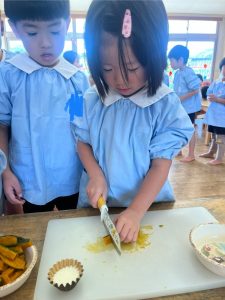 ので、さすが!切り方も上手になってきました。そして包丁を上に置いたら終わりの合図。次のお友達へ 。というお約束も守りながらしていた子どもたちです😌