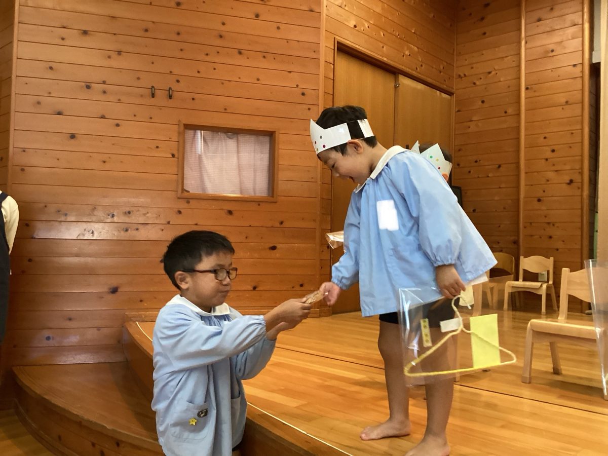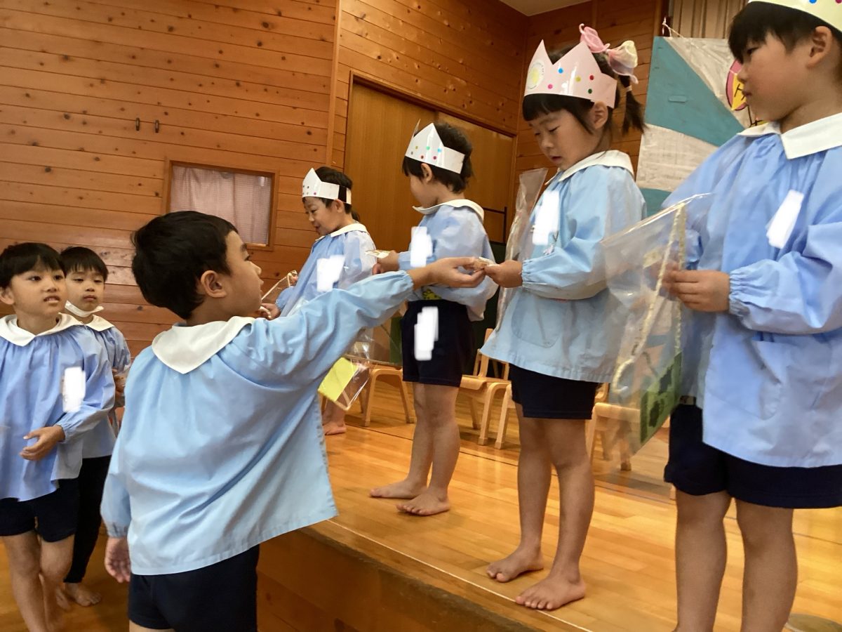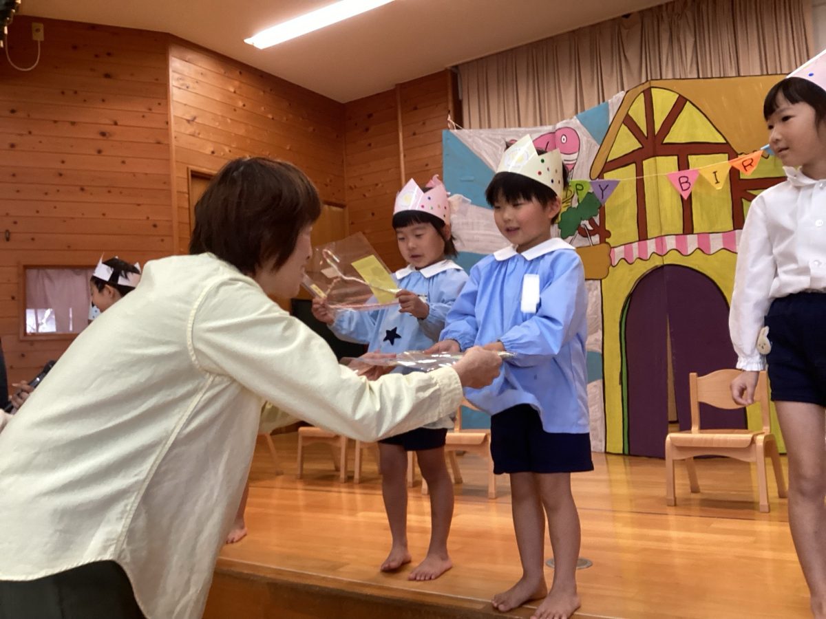 次に素敵なハンガーのプレゼントと、年長さんから美味しいクッキーや歌のプレゼントをもらい、とっても嬉しそうな姿が見られました👀