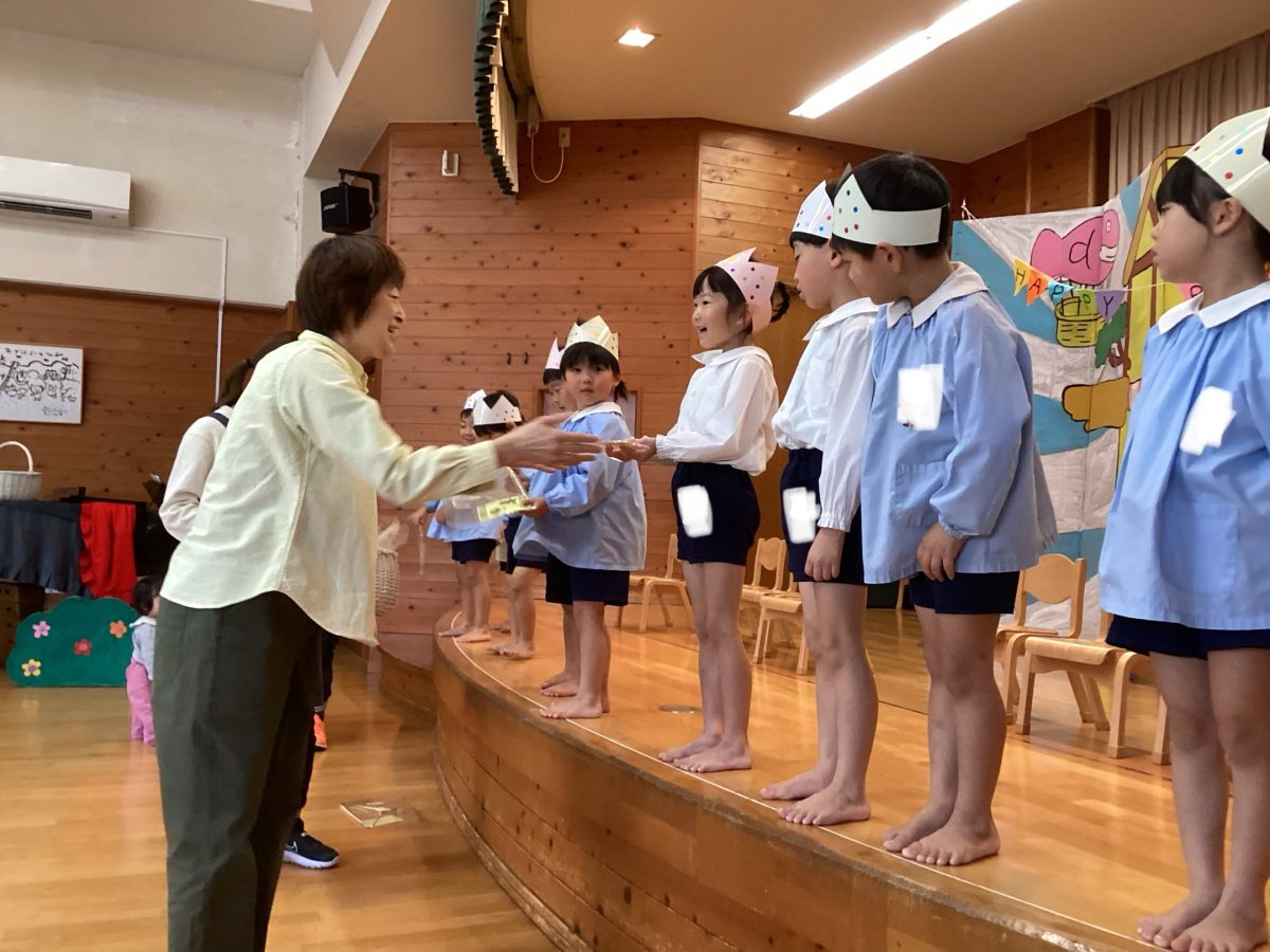 次に素敵なハンガーのプレゼントと、年長さんから美味しいクッキーや歌のプレゼントをもらい、とっても嬉しそうな姿が見られました👀