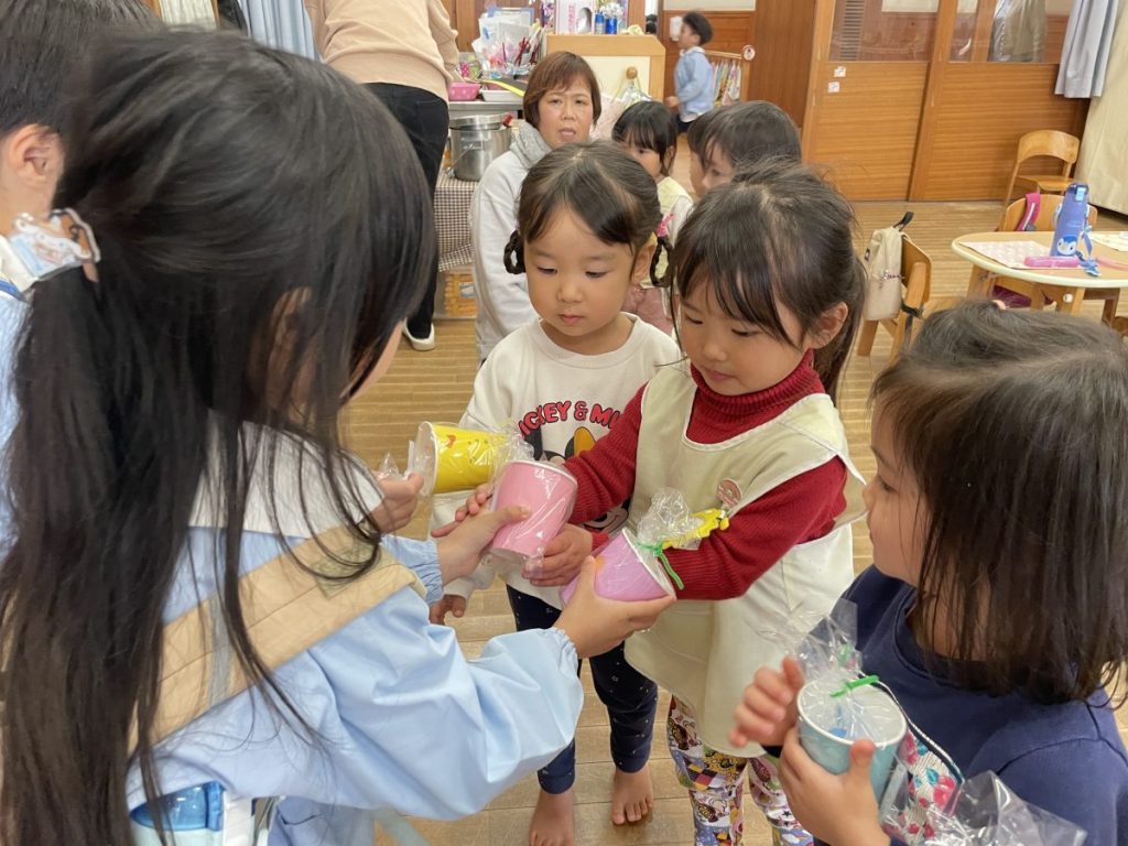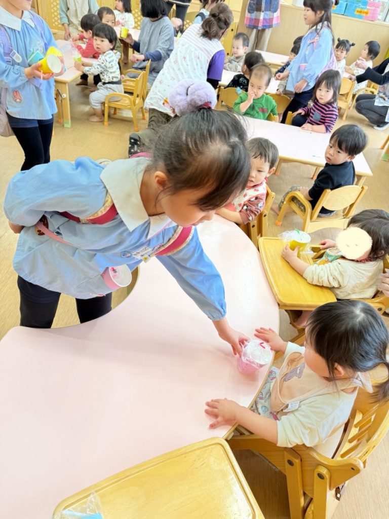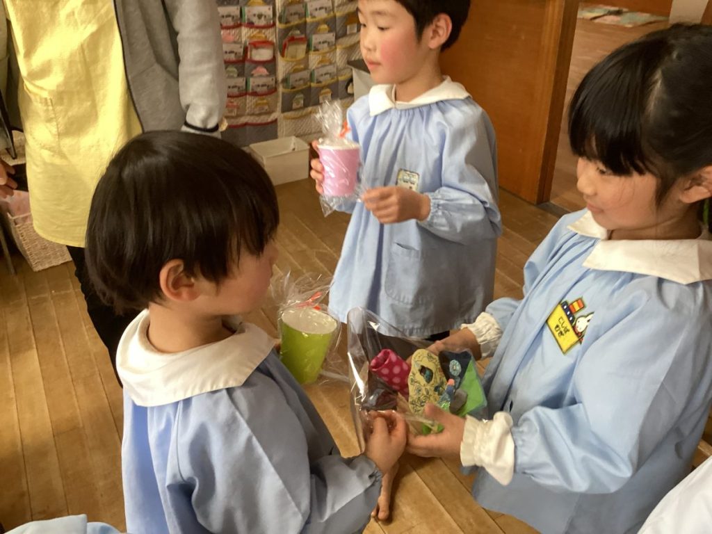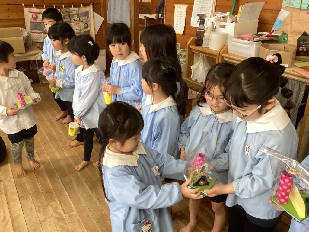 お別れ会の後には、0、1、2歳のお友達のところに年長さんがプレゼントを渡しにきてくれましたよ🎁